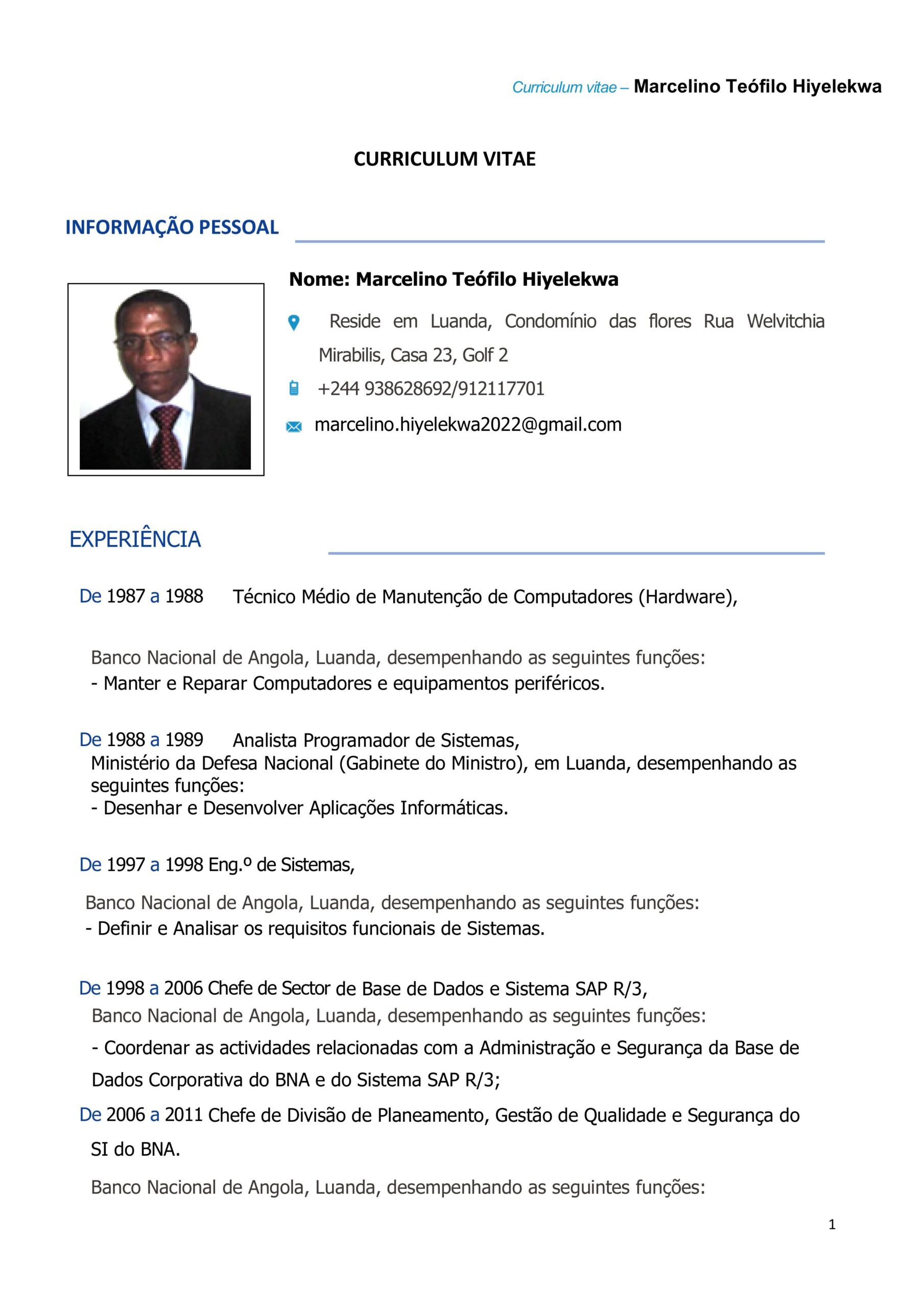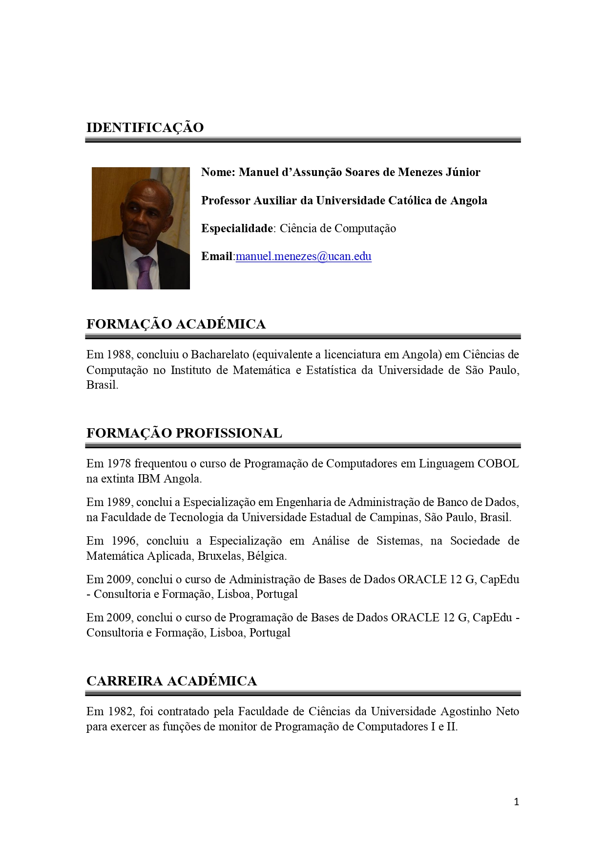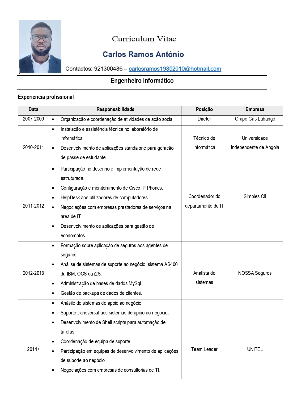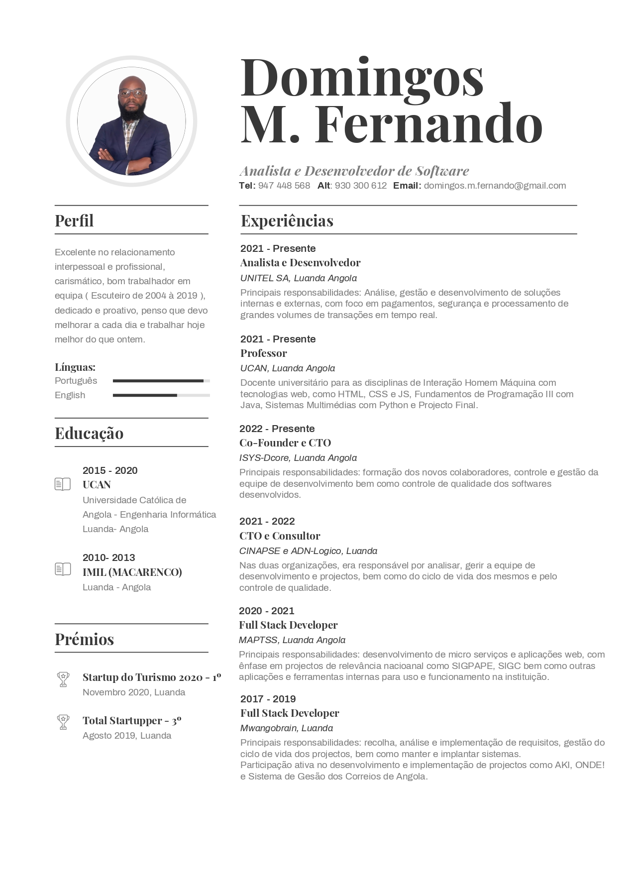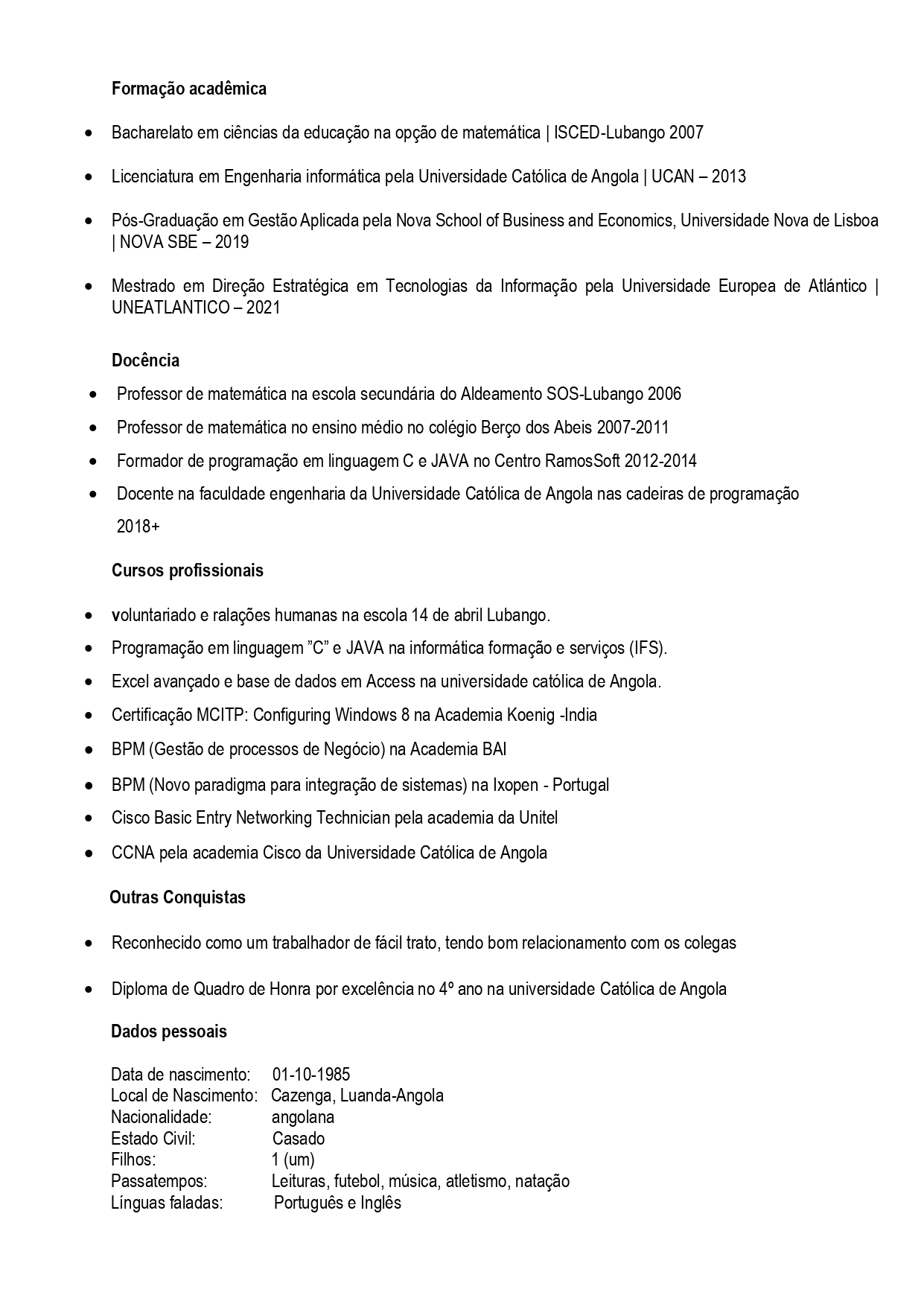 - Grau Académico: Licenciado em: Eng.ª Informática pela UCAN (2010) | Mestrado em Transformação Digital pela Funiber (em curso)
