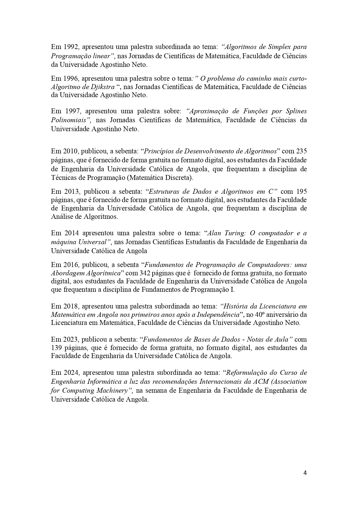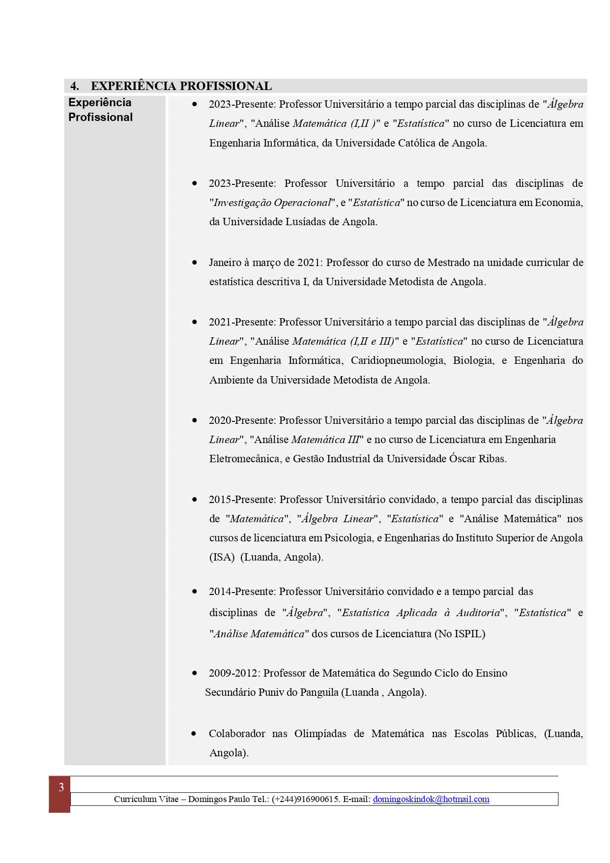 - Professor de: Álgebra Linear, Análise Matemática I, II e Estatística